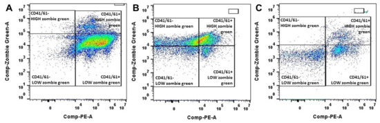 Samples were washed (1500× g, 15 min), resuspended in Tyrode’s media, and further incubated with polyclonal goat antimouse IgG (1:100) for 30 min at room temperature in the dark. Samples were washed (1500× g, 15 min), resuspended in 200 µL of the same Tyrode’s media, and immediately analyzed. This panel identified three different populations: (1) viable platelets (CD41/61+ with low zombie green intensity), (2) nonviable (damaged) platelets (CD41/61+ with high zombie green intensity), and (3) debris (CD41/61 negative with high and low zombie green intensity). The sample acquisition by Cytek Aurora flowcytometric analyzer was concluded when at least 1,000,000 fluorescent gated events or 150 µL of the sample were assessed. Single stain controls were used for compensation and unmixing the signals using SpectroFlow® software. Heat-treated platelets (75 °C, 15 min) served as a positive control for nonviable platelets. Data were analyzed with the software FlowJo (FlowJo, V10.6.2, BD Biosciences, Franklin Lakes, NJ, USA); the percentage of events in each population was calculated, and manual compensation was applied as needed.