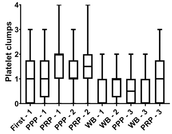 During the manual counting, the presence and quantity of platelet clumping were graded as score 0, absence of platelet clumps; score 1, small platelet clumps identified in the hemocytometer chamber, but not within the squares used to obtain the platelet count; score 2, small platelet clumps (~2–5 platelets/clumps) occurring in low numbers throughout the chamber and within the squares used for counting; score 3, presence of low numbers of larger platelet clumps (~5–20 platelets/clump), or high numbers of small platelet clumps; score 4, presence of many large platelet clumps, which would invalidate a manual platelet estimate. In addition, manual RBC, WBC, and platelet counts were performed on all PRP and PPP samples. The same board-certified clinical pathologist performed all the assessments.