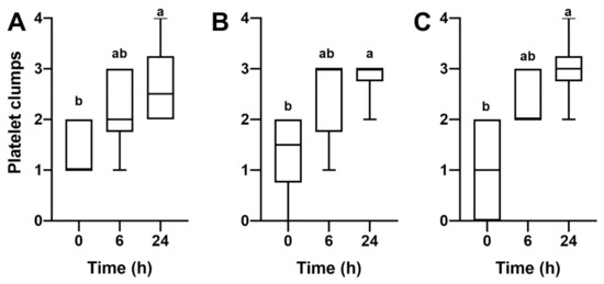 Presence of platelet clumps in PRP of six mares, having WB harvested and processed by 3 methods to prepare PRP for intrauterine infusions in mares and cooled-stored at 5 °C for up to 24 h. (A) Method 1 consisted of collecting WB in a blood transfusion bag, centrifugation of WB at 400× g/10 min (F-C), and centrifugation of plasma at 1000× g/10 min. (B) Method 2 consisted of one centrifugation at 120× g/10 min. (C) Method 3 consisted of collecting WB in a syringe and then letting it sediment in an upright position for 4 h. After processing (0 h), PRP was obtained across methods and cooled-stored at 5 °C for 6 and 24 h. Platelet, WBC, and RBC counts and platelet viability were assessed in fresh (0 h) and cooled-stored PRP at 6 and 24 h. Clumps classification: score 0, absence of platelet clumps; score 1, small platelet clumps identified in the hemocytometer chamber, but not within the squares used to obtain the platelet count; score 2, small platelet clumps (~2–5 platelets/clumps) occurring in low numbers throughout the chamber and within the squares used for counting; score 3, presence of low numbers of larger platelet clumps (~5–20 platelets/clump), or high numbers of small platelet clumps; score 4, presence of many large platelet clumps. Differences within column superscripts (a,b) indicate differences between groups (p < 0.05).