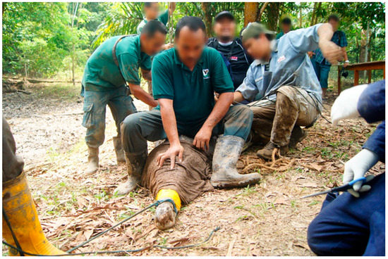 Using a rope the upper jaw of the false gharial was snared, the snared false gharial was then slowly and carefully pulled to the bank. Before the false gharial could be restrained, they were first blindfolded, by approaching the false gharial from the front and carefully placing a moist sack over the head to cover the eyes. This procedure limits visual stimulation to the false gharial. Lack of visual stimulation reduces movement and struggling, because the animals become disoriented [14]. Care was taken to ensure the nostril was not covered. To pin the head, a few people slowly sat on the neck while pressing the head to keep the jaw closed. The body was also pinned down by other people sitting on the back of the false gharial. This procedure also allows the control of the front and hind limbs. Strong pieces of rope and banding tape were used to secure the jaw. The limbs were also secured by tying them to the body (Figure 1).