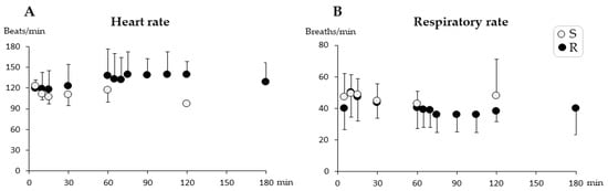 Heart rate (A) and respiratory rate (B) (mean ± SD) during short-term anesthesia recorded at 5, 10, 15, 30, and every 30 min from injection until recovery. Pigs from Group Single (S) (n = 6) received a single dose intramuscularly of dexmedetomidine 0.025 mg/kg, tiletamine 2.5 mg/kg, zolazepam 2.5 mg/kg, and butorphanol 0.1 mg/kg at time zero. Pigs from Group R (n = 6) also received one-third of the initial dose intravenously at 60 min. No significant differences were found between groups or over time.