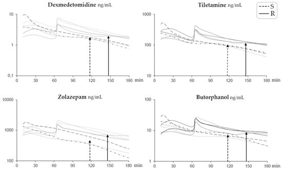 Profiles of log plasma concentrations for each drug over time for short-term anesthesia induced by intramuscular administration of dexmedetomidine 0.025 mg/kg, tiletamine 2.5 mg/kg, zolazepam 2.5 mg/kg, and butorphanol 0.1 mg/kg in pigs (n = 7). Group S (dotted lines n = 3) received a single dose at time zero. Group R (solid lines n = 4) also received one-third of the initial dose intravenously at 60 min. Time to first spontaneous movement is indicated with a dotted arrow for Group S and a solid arrow for Group R.