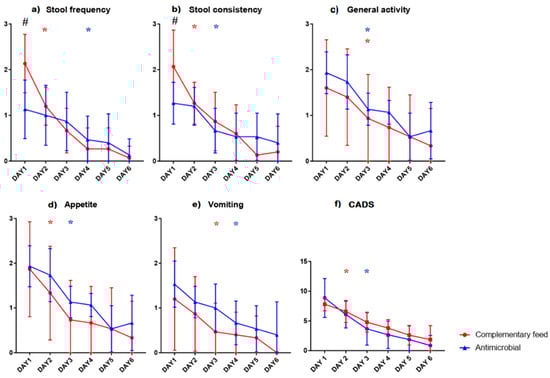 Mean values (y axes) for the parameters (a) stool frequency, (b) stool consistency, (c) general activity, (d) appetite, (e) vomiting and (f) CADS in the groups of dogs treated with complementary feed (group A; red) and antimicrobials (group B; blue). * Day on which the mean significantly decreased compared to day one for each group; color indicates group (p < 0.05). # Difference between treatments at any point in time (p < 0.05).