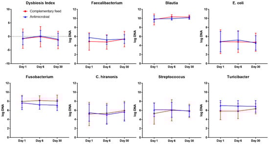 Bacterial taxa and the Dysbiosis Index in the groups of dogs treated with complementary feed (group A; red) and antimicrobials (group B; blue). There were no significant differences at any point in time between groups.