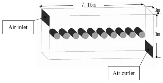 The geometric model is a simplified pig house. The length, width, and height of the pig house are 7.15 m × 3 m × 3 m, respectively. 10 cylinders with a diameter-to-length ratio of of 1:4 [38] are used to represent those sows. Assuming the sow is 200 kg, the area of the sow is 2.775 m2 [48,49]. To ensure that the environment inside the pig house is distinguishable, and to analyze the influence of different environments on the heat transfer of sows, the position of the air inlet is set higher than that of the sows, and the position of the air outlet is set lower than that of the sows. The details are shown in Figure 1.
