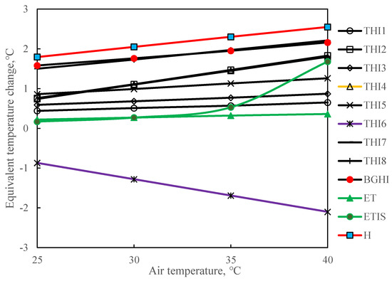 The equivalent temperature change method is used to compare the 12 environmental thermal indices. Figure 2 shows the equivalent temperature change of the relative humidity rising from 50% to 60% at temperatures of 25 °C, 30 °C, 35 °C, and 40 °C. It can be seen from Figure 2 that, except for THI6, the equivalent temperatures of other thermal indices are all positive. At different air temperatures, the equivalent temperature changes of THI1, THI3, THI5, and ET caused by changes in relative humidity are different, but the changing trends are nearly parallel to each other. The change trends of THI2, THI4, and THI7 are similar. For H, THI8, and BGHI at an air temperature of 25 °C, the change of 10% relative humidity causes an equivalent temperature of more than 1.5 °C. For ETIS, the equivalent temperature change becomes larger as the air temperature rises from 25 °C to 40 °C.