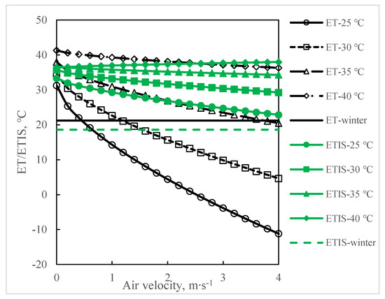 In order to determine the changes of ET and ETIS under different air velocities, the air temperature is set to 25 °C, 30 °C, 35 °C, and 40 °C, the relative humidity to 60%, and the air velocity is changed from 0 m·s−1 to 4 m·s−1 [43].