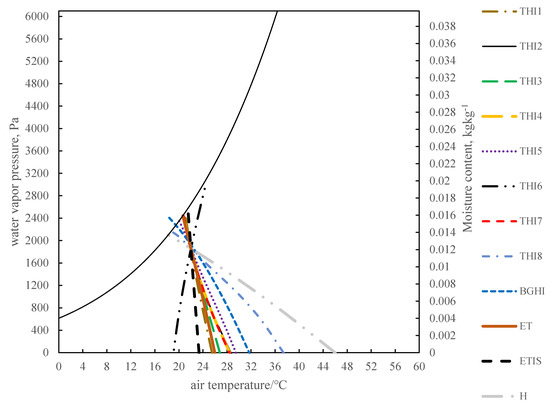 Figure 4 shows the thermal indices fitted on the psychrometric chart. The heat index value of THI6 at an air temperature of 25.4 °C and a relative humidity of 100% is consistent with the heat index value of an air temperature of 22 °C and a relative humidity of 70%. When the air temperatures are 46 °C, 37.41 °C, and 31.6 °C for H, THI8, and BGHI, respectively, under a relative humidity of 0%, the calculated H, THI8, and BGHI are the same as those of H, THI8, and BGHI with an air temperature of 22 °C and a relative humidity of 70%. The results of THI2, THI4, and THI7 are similar. For the relative humidity changes from 0% to 70%, assuming the THI2 constant, the air temperature will change from 22 °C to 28.4 °C. In THI5, the temperature varies greatly under different humidities. There is little difference in the performance between THI1, THI3, and ET. The heat index value of ETIS at an air temperature of 23.34 °C and a relative humidity of 100% is the same as the value under an air temperature of 22 °C and a relative humidity of 70%. It is important to note that the ETIS curve and the constant-temperature line in the psychrometric chart are different.