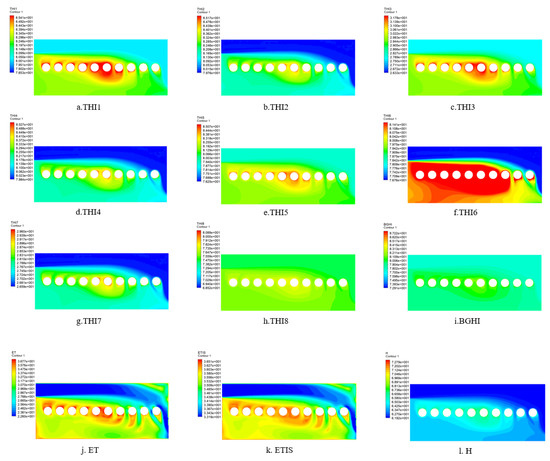 Figure 5 shows the distributions of the thermal index values. When using THI2, THI4, and THI7 to analyze the thermal conditions at different zones in the pig barn, it has been found that the patterns of all the three indices are the same, with a lower index value at the air inlet area and a higher value near the animal occupied zone, which indicates that there is a difference of thermal distribution in the pig house. The distribution patterns of THI1, THI3, and THI5 are similar. The index values of THI1, THI3, and THI5 in the air inlet area are lower than the THI2 value. The difference between THI8 and BGHI distributions is not clear. Both animal occupied zone and animal non-occupied zone have a high THI6 index. For ET and ETIS, as they include the influence of air velocity, they have better performances than other indices. The maximum values of all contours using different thermal indices are a temperature of 34 °C, a relative humidity of 60%, and an air speed of 0 m·s−1, and the minimum values are a temperature of 30 °C, a relative humidity of 60%, and an air speed of 1 m·s−1, while the sow is at 38 °C. In the contours of H, the color around the sow is lighter, indicating that the H index cannot conspicuously display the thermal conditions around the sow.