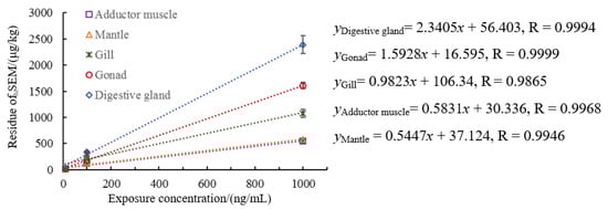 We detected semicarbazide in the adductor muscle, mantle, gills, disgestive gland, and gonads of scallops exposed to seawater contaminated by semicarbazide. In this method, the limits of detection (LOD) of semicarbazide was 0.25 μg/kg, while the limits of quantitation (LOQ) was 0.5 μg/kg, and the concentration values obtained from the experiment were higher than LOD. According to the literature, the semicarbazide levels near the Chaohe River estuary, in western Laizhou Bay and in Jincheng and Sishili Bay were 0.18–70.6 μg/kg, 10−11 kg/L and 0.011–0.093 μg/L, respectively [,,]. Based on the pollution status, we set three exposure concentrations of low, medium and high. We found a good linear relationship between semicarbazide level in scallop tissues and the exposure concentration. The correlation coefficients for the linear equations for each tissue were all >0.917 and very significant (Figure 1) (p < 0.01). These data indicated that an increase of semicarbazide exposure concentration in seawater resulted in corresponding significant positive increases in the tissues. The Kruskal–Wallis test revealed that there were significant differences among tissues (Kruskal–Wallis chi-squared = 26.998, df = 4, p < 0.01), suggesting that the concentrations of semcarbazide was dependent on the tissues.