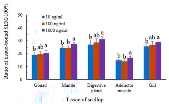 We determined the amounts of total and tissue-bound semicarbazide in the scallops and the free form was present in all tissues. The proportion of tissue-bound semicarbazide ranged from 12.1 to 32.7%. Nonparametric Mann–Whitney U test revealed that, for the tissue of gonad, digestive gland, and gill, the proportion of tissue-bound semicarbazide had significant difference between 10 ng/mL group and 1000 ng/mL group (p < 0.05), but no significant difference between 10 ng/mL group and 100 ng/mL, or 100 ng/mL and 1000 ng/mL (p > 0.05). For the tissue of mantle and adductor muscle, the proportion of tissue-bound semicarbazide had significant difference between 1000 ng/mL group and 100 ng/mL or 10 ng/mL (p < 0.05), but no significant difference between 10 ng/mL group and 100 ng/mL (p > 0.05). The proportion of tissue-bound semicarbazide remained relatively stable and did not increase with the increase of exposure concentration. The ratio of tissue-bound semicarbazide in gonads was 16.9–22.4%, mantle 22.9–28.5%, disgestive gland 27.3–32.7%, adductor muscle 12.1–17.8%, and gills 23.1–30.7%. The proportion of tissue-bound semicarbazide was the highest in disgestive gland tissue and lowest in adductor muscle. The proportion of tissue-bound semicarbazide in different tissues from high to low was as follows: viscera mass > gill > mantle > gonad > adductor muscle (Figure 2).