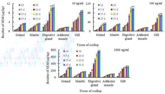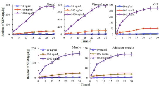 We then examined accumulation of semicarbazide from culture water at 10, 100, and 1000 ng/mL over time. Drug concentration–time curve (Ci-Ti) refers to the curve of drug concentration changing with time, which reflects the dynamic process of drug in vivo to a certain extent. In the early stage of exposure, the tissue-bound semicarbazide increased rapidly and stabilized at increasing concentrations. The stable accumulation time for accumulation in gonads, adductor muscle and gills was 25 d while a small increasing trend was seen for bound semicarbazide in viscera and mantle. The steady-state accumulation time of semicarbazide in scallop tissues required an extended period of time and residual semicarbazide in the same tissues also differed. Two-ways ANOVA was used to analyze the effects of exposure concentration and exposure time on the residues of bound SEM in scallop. The results showed that there was no interaction between exposure concentration and exposure time on the residues of tissue-bound SEM in scallop. For the same tissue, the effects of exposure concentration and exposure time on tissue-bound SEM residue were significant (p < 0.001), which means an increase of exposure concentration or exposure time resulted in corresponding tissue-bound SEM increases in levels. However, the enrichment rate decreased after 20 d and gradually tended to be stable (Figure 3).