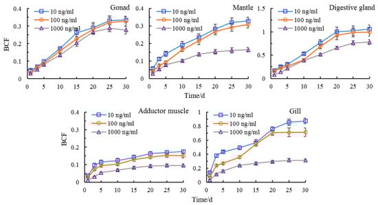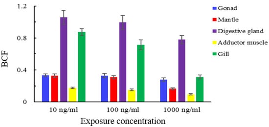 Bioaccumulation refers to the ability of pollutants to enter and accumulate in organisms from the environment and then be transferred and accumulate in the food chain. Higher levels of bioaccumulation pose higher chronic harm to organisms across the food chain [,,]. The BCF is used to measure the accumulation trend of pollutants in organisms and to describe the bioaccumulation effect of pollutants. The BCF of semicarbazide in the same tissue gradually increased and tended to be stable with the increase of time at each exposure concentration. When the pollutants enter the scallop, the process of accumulation and metabolism coexist. For instance, in the early stage, the accumulation rate was higher than the metabolic rate and in the later stages the accumulation and metabolic processes gradually reached a balance. However, different tissues had different bioaccumulation ability for semicarbazide. At 30 days, the BCF of tissue-bound semicarbazide in disgestive gland had the highest bioaccumulation ability while the muscle had the lowest at the same exposure concentration. The order for the BCF was viscera mass > gill > gonad > mantle > adductor muscle (Figure 5).
