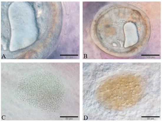 The microscopical examination of the fresh mounts of parasites allowed one to ascribe the TM to the Heterophyidae genera Heterophyes, Stictodora, and Phagicola (Ascocotyle) (Figure 1A,B) and the MP to Myxobolus sp. (Myxobolidae) (Figure 1C,D) in the liver, spleen, heart, and kidney (Figure 1).