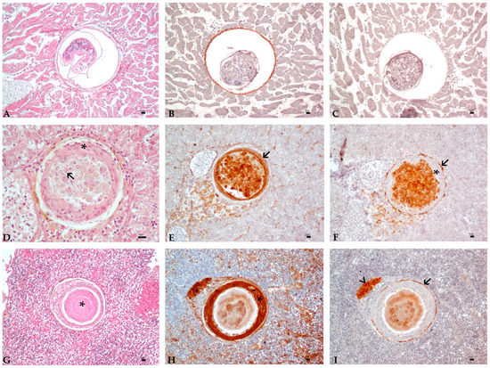 Figure 2. (AI): Histology and immunohistochemistry panel of granuloma developmental stages in Mugilidae infected organs. Bar 10 µm. Serial section of the same samples in rows (A–C), (D–F) and (GI). (AC): Stage I (pre-granuloma stage). Heart. (A): TM encysted surrounded by a thin eosinophilic layer of compressed myocardial cells (HE, 20×). (B): IHC—positive labeling for the anti-cytokeratin antibody is expressed by parasite capsule (CKAE1/AE3 antibody, 20×). (C): IHC—absence of immunoreactivity to anti-vimentin antibody (Vimentin antibody, 20×). (DF): Stage II (intermediate-stage granuloma). Liver. (D): Myxozoan spores (arrow) intermingled with necrosis and surrounded by a few layers of epithelioid cells (asterisk) (HE, 40×). (E): IHC—immunoreactivity for the anti-cytokeratin antibody in the EC layers (arrow) (CKAE1/AE3 antibody, 20×). (F): IHC—mild signal of immunoreactivity to anti-vimentin antibody in the fibroblast layer (arrow) around negative epithelioid cells (asterisk) in this stage (Vimentin antibody, 20×). (GI): Stage III (late-stage granuloma). Spleen. (G): Central necrotic core (asterisk). (H): IHC—positive labeling for anti-cytokeratin antibody in a thicker layer of ECs in this stage (asterisk) (CKAE1/AE3 antibody, 20×). (I): IHC—positive labeling to the anti-vimentin antibody of the outer layer of fibroblasts (arrow). An aggregate of macrophages is occasionally observed in proximity to the lesion (arrowhead) (Vimentin antibody, 20×).