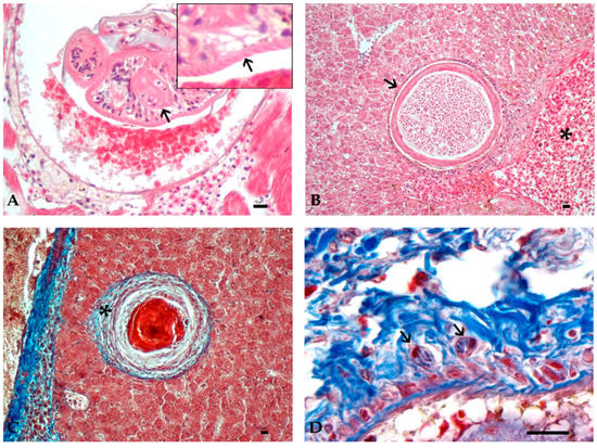 Figure 3. (AD): Histological features of granuloma structure and cellular components in Mugilidae infected organs by histozoic parasites. Bar 10 µm. (A): Encysted metacercaria in the heart with evident ventral sucker (arrow). Inset. Magnification of cuticle spines (arrow) on larva surface (HE, 40×). (B): Plasmodium containing spores of myxozoan parasites surrounded by an eosinophilic capsule (arrow) in the liver close to a blood vessel (asterisk) (HE, 20×). (C): Collagen fibers in the outer layer of late-stage granuloma (asterisk) (MT, 20×). (D): Rodlet cells (arrows) in perivascular collagen (MT, 100×).