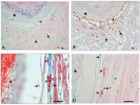 Mast cells also showed a strong cytoplasmic positive signal to anti-vimentin antibody (Figure 4B). In both affected and unaffected samples, MCs were occasionally observed near vascular structures. In the pre-granuloma stage, MCs were close to parasites, whereas in the intermediate- and late-stage granulomas, MCs migrated to the more external layers. They were indeed more commonly observed intermingled with fibroblasts and sometimes detected in close contact to the fibroblasts membrane, elongated in shape with loosely arranged granules (Figure 4C,D).