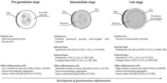 The results of the structural components of granulomas and associated immune cells, as well as the description of histological parasite characteristics, were combined in a general scheme of possible developmental stages of granuloma formation (Figure 5).