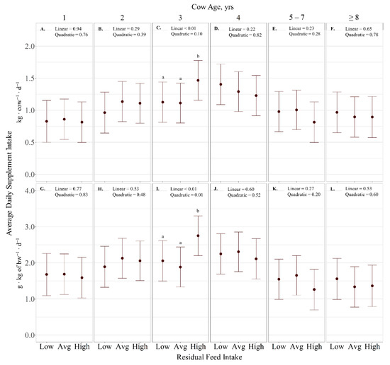 Influence of RFI × cow age (p < 0.01) on average daily supplement intake (expressed as g ∙ kg−1 of BW ∙ d−1 (A–F), as well as kg ∙ cow−1 ∙ d−1 (G–L) ± SE) by cattle grazing dormant mixed-grass prairie in 2018/2019 and 2019/2020 at the Northern Agriculture Research Center’s Thackeray Ranch, Havre, MT, USA. Means lacking common letters (a, b) differ (p < 0.05).