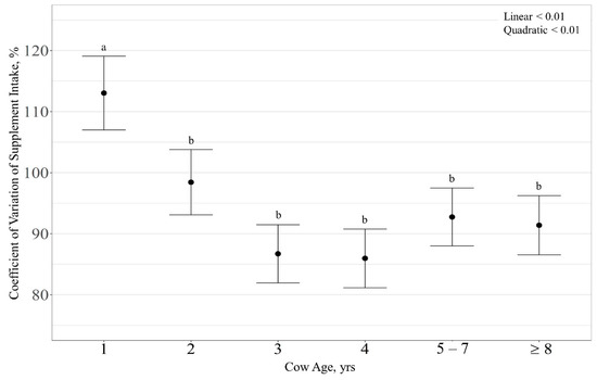 Although limited, previous experiments evaluating supplement intake of mixed-age beef herds have reported that younger cows spent less time at the supplement feeders and consumed less supplement than older cows [53,54]. In contrast, Wyffels et al. [44] reported that younger cattle consumed more supplement and visited the supplement feeders more often than older cows. Results from our research are similar to Wyffels et al. [44], since we observed a quadratic effect in supplement intake related to cow age, where 1-year-old cows consumed more and had a larger CV of supplement intake than older cows.