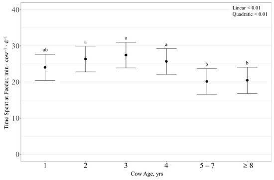 There was no effect (p > 0.13) of RFI or cow age observed on supplement intake rate, with supplement intake rate averaging 60.6 ± 32.0 g ∙ min−1. Time spent at the feeders was quadratically influenced (p < 0.01) by cow age, where 2-, 3-, and 4-year-old cows spent more time at the feeders than 1-, 5–7-, and ≥8-year-old cows (p < 0.02; Figure 4). However, time spent at the feeders exhibited a tendency for an RFI × cow age interaction (p = 0.08), with a quadratic effect (p = 0.03) of RFI for 5–7-year-old cows, where average-RFI cows tended to spend more time at the feeders than high-RFI cows (p = 0.08).