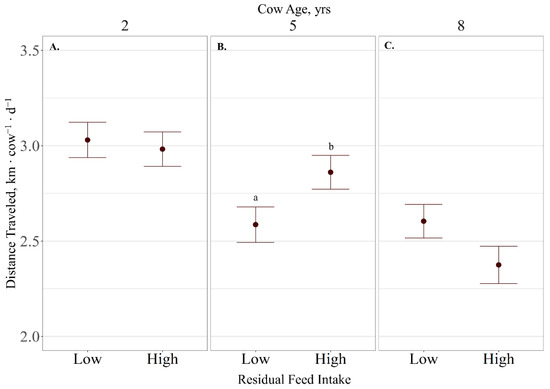 Influence of residual feed intake × cow age (A–C; p = 0.02) on average distance traveled expressed as km cow−1 ∙ d−1 ± SE) by cattle grazing dormant northern mixed-grass prairie in 2018/2019 and 2019/2020 at the Northern Agriculture Research Center’s Thackeray Ranch, Havre, MT, USA. Means lacking common letters (a, b) differ (p < 0.05).