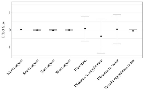 Herd-level grazing resource utilization for cattle on dormant rangeland forage was not impacted by aspect ( North = 0.02 ± 0.01; South = −0.01 ± 0.01; East = −0.02 ± 0.02; West = −0.01 ± 0.02), elevation ( = 0.07 ± 0.37), distance to supplement ( = −0.37 ± 0.51), distance to water ( = 0.04 ± 0.44), or terrain ruggedness ( = −0.06 ± 0.03; Figure 6). However, resource utilization relative to elevation, distance to supplement, and distance to water were highly variable among individuals (herd-level SE of standardized coefficients > 0.25; Figure 7). Therefore, we conducted a post hoc analysis evaluating the effects of RFI, cow age, and the interaction of RFI and cow age on grazing resource utilization relative to elevation, distance to supplement, and distance to water.