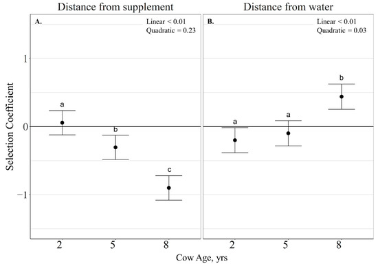 Significant predictors of resource use were determined by standardized coefficients with 95% confidence intervals not overlapping zero [37,38]. Significant resource utilization coefficients were determined to be greater or less than expected based on availability of the covariate within the pasture [35,36]. For pasture level covariates displaying high herd-level variability in grazing resource utilization (herd-level SE of standardized coefficients > 0.25; [44]), a post hoc analysis was conducted to evaluate the effects of RFI, cow age, and the interaction of RFI and cow age on resource use coefficients relative to each pasture covariate, using ANOVA with a generalized linear mixed model, with a Gaussian error structure, including year as a random intercept. An alpha ≤ 0.05 was considered significant with animal considered as the experimental unit. For age main effects, linear and quadratic effects were determined by using orthogonal polynomial contrasts for each analysis. The Tukey method was used to separate means when p < 0.05. Tendencies were considered when p ≤ 0.10.