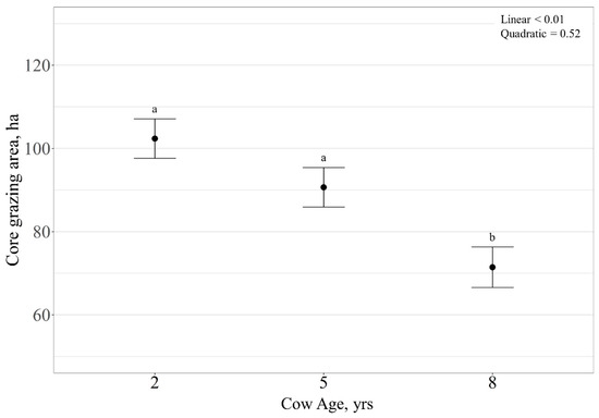 Influence of cow age on core grazing area (expressed as ha ± SE) by cattle grazing dormant northern mixed-grass prairie in 2018/2019 and 2019/2020 at the Northern Agriculture Research Center’s Thackeray Ranch, Havre, MT, USA. Means lacking common letters (a, b) differ (p < 0.05).