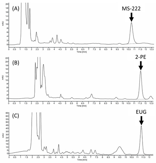 The HPLC system consisted of a pump (1260 Infinity II, Agilent Technologies, Santa Clara, CA, USA), a UV-visible detector (1260 Infinity II, Agilent Technologies, Santa Clara, CA, USA), and a C-18 column sized 150 × 4.6 mm (Apollo, Hichrom, UK) for the MS-222 and 250 × 4.6 mm (Mightysil, Kanto, Japan) for the 2-PE and EUG analyses. The mobile phases were mixtures of acetonitrile, methanol, and the phosphate buffer (10 mM NaH2PO4-Na2HPO4, pH 5) at a ratio of 30:0:70, 17:17:66, and 45:0:55 v/v for the analysis of MS-222, 2-PE, and EUG, respectively. The detection wavelengths were 220, 218, and 200 nm; the flow rate was 1 mL/min and the injection volume was 50 μL.