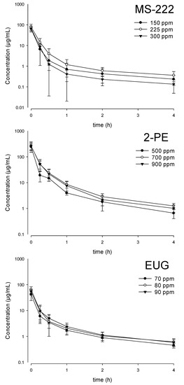 The serum concentration time profiles of the three anesthetics at the three doses after the termination of the bath administration are presented in Figure 2. Following the transfer of the fish into the recovery tanks, the serum concentration of the three anesthetics revealed a multi-exponential decay with rapid elimination. All three anesthetics decreased by more than 90% within the first hour, and at the last blood sampling time point (t = 4 h), only 0.2–0.5% of MS-222 remained in the serum. Similarly, only 0.3–0.5 and 0.9–1.1% of 2-PE and EUG remained in the serum after 4 h (data not shown). At the optimal doses, the highest serum concentration was observed in the 900 ppm 2-PE groups, followed by the 90 ppm EUG and the 300 ppm MS-222 group (Figure 3); the serum concentrations at 4 h were 1.01, 0.59, and 0.13 μg/mL, respectively.