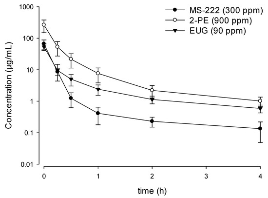 Serum concentration time profile (mean ± SD) of tricaine methanesulfonate (MS-222), 2-phenoxyethanol (2-PE), and eugenol (EUG) in Nile tilapia during the recovery phase following immersion at the optimal doses at 28 °C (n = 7).