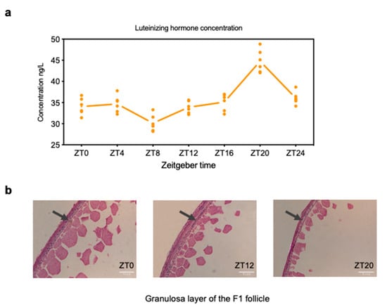 Changes in serum luteinizing hormone (LH) level and H&E-stained follicle granulosa layer among three stages of the ovulatory cycle. (a) LH concentration was measured in chicken serum during the ovulatory cycle (4-h intervals from ZT0 to ZT24 and six repetitions for each stage), and the highest LH level was detected at the ZT20 stage. (b) Chicken F1 follicles were embedded in paraffin and stained with hematoxylin and eosin (H&E) at ZT0, ZT12, and ZT20. ZT0 (9:00 a.m.), ZT12 (9:00 p.m.), and ZT20 (5:00 a.m.) represent the early, middle, and LH surge stages, respectively, of the ovulatory cycle.