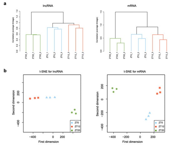 The F1 follicle could influence follicular development and the ovulatory cycle by regulating hormone levels. Secretion of progesterone is sensitive to the LH surge [35], which occurs in granulosa cells of the F1 follicle. This complicated process of events requires a highly orchestrated program of gene expression and is regulated by various factors. According to the present study, lncRNAs and mRNAs tended to display a stage-dependent expression profile, consistent with other studies [36,37,38]. Hierarchical clustering and t-SNE analyses demonstrated that expression profiles between the ZT20 and ZT12 stages were markedly different from those of the ZT12 and ZT0 stages (Figure 2a,b), suggesting that the expression changes of lncRNAs and mRNAs were associated with serum LH level during the ovulatory cycle. By contrast, the similar expression profiles at the lncRNA and mRNA levels of the ZT0 and ZT12 stages before the LH surge implies that massive molecular and physiological changes associated with follicle development occurred during the LH surge period. Additionally, an identical pattern was observed between lncRNA and mRNA expression, consistent with a study of Yang et al. [39], indicating that the dynamic changes in lncRNA and mRNA transcriptomes function coordinately in related physiological processes. Briefly, these results suggest that the samples were reliable and could be used for further analyses.