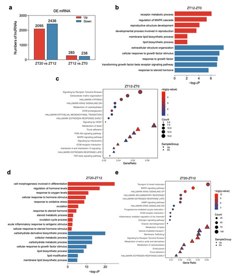 Functional enrichment analyses of the DEGs in the ZT12-ZT0 and ZT20-ZT12 groups revealed that the DEGs up-regulated in the ZT12-ZT0 group were enriched in receptor metabolic process (GO:0043112), membrane lipid biosynthetic process (GO:0046467), and lipid biosynthetic process (GO:0008610), hallmark estrogen response early (M5906), response to progesterone (GO:0032570) (Figure 3b,c, Table S4), while the DEGs down-regulated in the ZT12-ZT0 group were mainly enriched in the cellular response to growth factor stimulus (GO:0071363), transforming growth factor-beta receptor signaling pathway (GO:0007179), response to steroid hormone (GO:0048545), MAPK signaling pathway (hsa04010), and response to steroid hormone (GO:0048545) (Figure 3b,c, Table S4). Similarly, DEGs up-regulated in the ZT20-ZT12 group were enriched in cell morphogenesis involved in differentiation (GO:0000904), regulation of hormone levels (GO:0010817), response to oxygen levels (GO:0070482), cellular response to hormone stimulus (GO:0032870), steroid metabolic process (GO:0008202), and response to steroid hormone (GO:0048545). The up-regulated DEGs in this group were also enriched in regulation of inflammatory response (GO:0050727), acute inflammatory response to antigenic stimulus (GO:0002438), ovulation (GO:0030728), ovulation cycle process (GO:0022602), progesterone-mediated oocyte maturation (hsa04914), and estrogen signaling pathway (ko04915) (Figure 3d,e, Table S4). DEGs down-regulated in the ZT20-ZT12 group were mainly enriched in lipid biosynthetic process (GO:0008610), lipid modification (GO:0030258), cellular response to lipid (GO:0071396), and metabolism of lipids (R-HSA-556833). (Figure 3d,e, Table S4).
