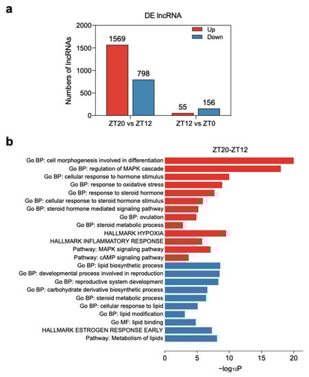 A total of 211 and 2367 DELs were detected in the ZT12-ZT0 and ZT20-ZT12 groups, respectively. Of these DELs, 55 were up-regulated and 156 were down-regulated in the ZT12-ZT0 group, while 1569 were up-regulated and 798 were down-regulated in the ZT20-ZT12 group (Figure 4a, Table S5). Consistent with the DEGs data, more DELs were detected in the ZT20-ZT12 group than in the ZT12-ZT0 group. LncRNAs can act alongside cis factors, but diffusion or transport to other cellular compartments render these lncRNA transcripts too dilute to mediate a plausible function [30]. Therefore to predict the functional role of lncRNAs identified in this study, the DEGs within the 100-kb upstream and downstream regions of each DEL were assumed to act as cis target genes [31]. Only a few cis target genes of DELs in the ZT12-ZT0 group were detected, therefore functional enrichment analysis focused on DEGs located near the DELs in the ZT20-ZT12 group to explore their functions during the LH surge period. Targets of up-regulated DELs in the ZT20-ZT12 group were related to cell morphogenesis involved in differentiation (GO:0000904), cellular response to hormone stimulus (GO:0032870), signaling by receptor tyrosine kinases (R-HSA-9006934), regulation of MAPK cascade (GO:0043408), response to steroid hormone (GO:0048545), and response to oxygen levels (GO:0070482) (Figure 4b, Table S6). On the other hand, targets of down-regulated DELs in the ZT20-ZT12 group were enriched in lipid biosynthetic process (GO:0008610), the developmental process involved in reproduction (GO:0003006), hallmark estrogen response early (M5906), cellular response to lipid (GO:0071396), and metabolism of lipids (R-HSA-556833) (Figure 4b, Table S6).