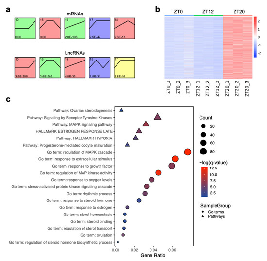Time-series analysis was adopted to explore the dynamic expression pattern of lncRNAs and mRNAs, which revealed that both lncRNAs and mRNAs were dynamically expressed and had similar expression patterns during the ovulatory cycle. DEGs in cluster 10 were up-regulated at the ZT20 stage and were mainly related to oxidative stress, steroids regulation, and ovulation events, including response to growth factor (GO:0070848), stress-activated protein kinase signaling cascade (GO:0031098), response to oxygen levels (GO:0070482), ovarian steroidogenesis (ko04913), and ovulation (GO:0030728) (Figure 5, Table S9), implying that these highly expressed genes could contribute to follicle maturation and ovulatory process. For example, RGS2 was involved in the ovulation events [59], and STAR was the highest expressed DEG at the ZT20 stage (Figure 6c), which is related to steroidogenesis and encodes a steroidogenic acute regulatory protein that is instrumental in steroid hormone synthesis and ovulation during follicle development [67,68,69].