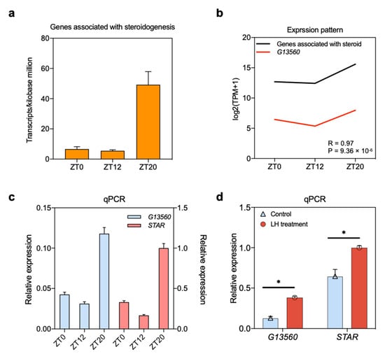 Furthermore, gene expression correlation coefficients were calculated to directly predict the functional correlation of lncRNAs across three stages of the ovulatory cycle (Figure 6). The highly abundant lncRNA G13560 had similar expression patterns to the steroid-related genes in the RNA-seq data over the three stages, which showed the highest expression at the ZT20 stage (Figure 6b). This implied that these genes involved in steroids regulation associated with changes in serum LH levels. Due to the lack of lncRNA annotation, especially lncRNA in farm animals like chickens, the co-expressed targets of lncRNA could be to predict the lncRNA functions. The abundance of G13560 and STAR with a high correlation coefficient over the ovulatory cycle were highly expressed in the ZT20 stage. Then, the cultured cells were treated with LH, and both the co-expressed genes were also upregulated in vitro (Figure 6d). Thus, we propose that G13560 and STAR may co-regulate the functions activated by LH surge-induced cascade in granulosa cells. All of the above findings suggested that the biological functions of the DEGs and DELs regulate follicle development in chickens during the ovulatory cycle.