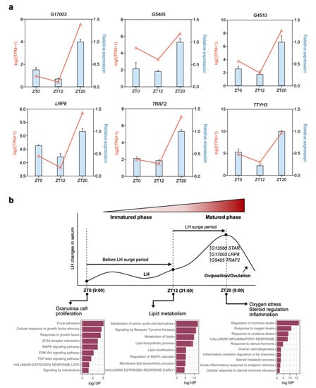qPCR verification of differentially expressed genes (DEGs) and differentially expressed lncRNAs (DELs) during follicle development. (a) Expression patterns of three DELs (G17003, G5405, and G4501) and three DEGs (LRP8, TRAF2, and TTYH3) were validated by qPCR. The x-axis represents the three developmental stages during the ovulatory cycle. The y-axis represents the relative expression levels of each gene; the left blue color represents relative expression by qPCR, and the right red color is the value of RNA-seq data with log2(TPM + 1). Data are shown as means ± SD and are representative of at least three independent experiments. (b) Transcriptome-wide RNA sequencing dynamics to reveal main functional factors of granulosa cell during follicle development. ZT0 (9:00 a.m.), ZT12 (9:00 p.m.), and ZT20 (5:00 a.m.) represent the early, middle, and LH surge stages, respectively, of the chicken ovulatory cycle.