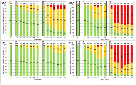 Figure 1 shows the KBD prevalence assessed intra vitam in the course of the laying period. The corresponding significant differences in KBD frequencies between layer lines and housing systems within the single weeks of age are given in Table 1. After the rearing period at the end of 15 weeks of age (Figure 1, Part A), none of the L68- and R11-hens showed KBD and only one BLA-pullet had a slight deformity. In contrast, WLA hens showed a significantly higher frequency of KBD of six hens (approx. 3%) affected by a slight to severe deformity. In single cages (Figure 1, Part C), L68 hens were significantly less affected by KBD than BLA hens at any time of examination (Table 1). The same tendency was observed within the floor housing system (Figure 1, Part B), but significant results were only detected for the 69th week of age. While KBD occurred significantly more often and more severe in hens of the white-egg layer lines compared to the brown ones at any time of examination within the cage system, in the floor housing system, the same trend was seen from the 29th week of age onwards, without reaching a significant value at any day of scoring. With the exception of the 21st week of age, where WLA (45.83%) hens kept in cages showed less deformities than R11 (76.39%), no significant differences were detected between the two white-egg layers within the same housing system. In all layer lines, KBD appeared significantly more often with a higher degree of severity in hens housed in cages (Figure 1, Part C) than in floor pens (Figure 1, Part B). The smallest differences between the two housing systems were recorded for L68 and reached a significant level in the 57th and 61st week of age. The compartment size of the floor housing system had no significant effect on the occurrence of KBD.