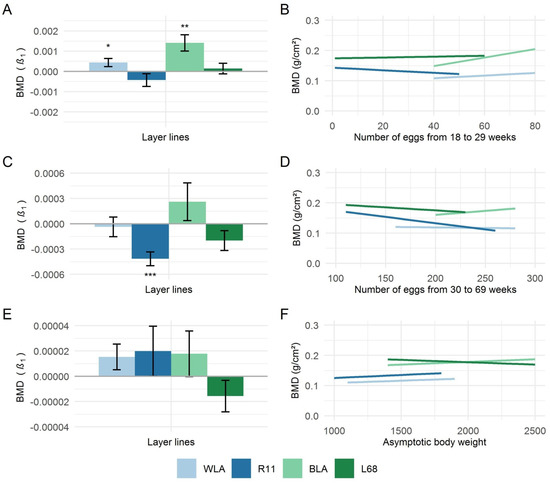 Regression coefficients () ± standard errors of regression of total number of eggs laid from 18 to 29 weeks of age (A), total number of eggs laid from 30 to 69 weeks of age (C) and the adult body weight at 69 weeks of age (E) pertaining to the bone mineral densities (BMD) of the keel bone, and the effect of total number of eggs laid from 18 to 29 weeks of age (B), total number of eggs laid from 30 to 69 weeks of age (D), and the adult body weight at 69 weeks of age (F) on the BMD of the keel bone in four chicken layer lines (WLA, R11, BLA, L68). Significant regression coefficients are marked with asterisks (* p < 0.05, ** p < 0.01, *** p < 0.001).
