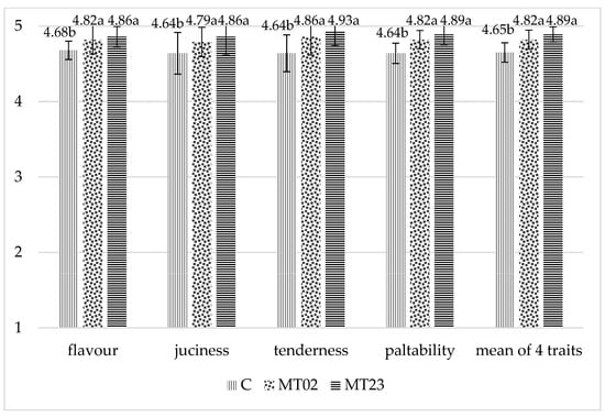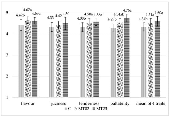 Sensory evaluation of breast muscles (point). C—control, MT02—milk thistle (0%/2%—starter/grower), MT23—milk thistle (2%/3%—starter/grower), SEM—standard error of mean, n = 8, a,b—means with different superscripts within a row are significantly different at p ≤ 0.05.