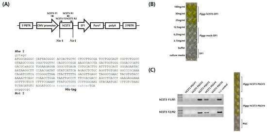 Chicken DF1 cell line was preliminarily utilized to examine the expression of hCST3 protein. DF1 is a chicken embryonic fibroblast cell line that was spontaneously transformed and immortalized from 10-day-old embryo. A PGC line (Pw66) derived from 6-day-old male embryonic gonads of White Leghorn (WL) chickens was maintained and subpassaged according to our previous report [13,14]. Briefly, chicken PGCs were maintained with knockout Dulbecco’s modified Eagle’s medium (Invitrogen, Carlsbad, CA, USA) supplemented with 20% fetal bovine serum (FBS, Invitrogen, Carlsbad, CA, USA), 2% chicken serum (Sigma-Aldrich, St. Louis, MO, USA), 1x nucleosides (Millipore, Temecula, CA, USA), 2 mM L-glutamine, 1× nonessential amino acids, β-mercaptoethanol, 10 mM sodium pyruvate, and 1× antibiotic–antimycotic (Invitrogen, Carlsbad, CA, USA). Human basic fibroblast growth factor (bFGF; 10 ng/mL; Koma Biotech, Seoul, Korea) was used for PGC proliferation. Chicken PGCs were cultured in an incubator at 37 °C with an atmosphere of 5% CO2 and 60–70% relative humidity. The cultured PGCs were subcultured onto mitomycin-inactivated mouse embryonic fibroblasts (MEFs) in 5- to 6-day intervals by gentle pipetting without any enzyme treatment. The transfection procedure was conducted according to our previous report [15,16]. hCST3 and transposase expression vector were co-transfected into chicken PGCs or DF1 cells by lipofection with Lipofectamine 3000® reagent (Invitrogen, Carlsbad, CA, USA). One day after transfection, 10 μg/mL puromycin was added to the culture media for selection. Additionally, to isolate single-cell-derived hCST3-expressing PGC sublines (hCST3-PGC#1-#5), a single PGC was picked up using a micropipette under the microscope (Nickon, Tokyo, Japan) and dropped onto a 96-well culture plate with an MEF feeder layer (CEFO Bio, Seoul, Korea). To examine the migration capacity in vivo, piggyBac GFP expression vector was also integrated into hCST3-PGC#3.