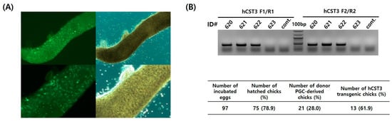 Production of hCST3 transgenic chickens. (A) Detection of GFP-expressing hCST3-transgenic chicken PGCs. GFP-positive chicken PGCs were detected in the recipient embryonic gonads (6-day-old) after transplantation. (B) Production of hCST3 transgenic chickens through testcross analyses. Ultimately, 13 hatched chicks were identified as transgenic chickens by genomic DNA PCR analyses. ID# is the individual number of donor PGC-derived chicks.