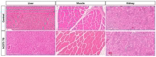 Muscles (pectoralis major), liver, and kidney of wild-type and hCST3 transgenic chickens were cut into small pieces (0.5 × 0.5 × 1.0 cm) and fixed in formalin [10% (v/v) formaldehyde in phosphate-buffered saline] for histological examination. Paraffin-embedded tissue blocks were obtained, and sections (4 µm thick) from the mid-portions of wounds were stained with hematoxylin-eosin (H&E, Vector Labs, Burlingame, CA, USA) after deparaffinization. All slides were histologically observed under an Aperio AT2 slide scanner (Leica Biosystems, Wetzlar, Germany).