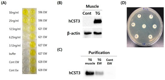 Quantification and antimicrobial activity test of hCST3 in transgenic chickens. (A) Quantification of hCST3 in the egg white (EW) of transgenic hens by ELISA. hCST3 was detected in all of the transgenic hen eggs. (B) hCST3 was detected in the muscle of hCST3 transgenic chickens by Western blotting. (C) His-tagged hCST3 in muscle and egg white of hCST3 transgenic chickens was purified and detected by Western blotting after purification with Ni-NTA magnetic nanobeads. (D) Biofunctional activity of hCST3 from transgenic hen eggs. The purified hCST3 from transgenic hen egg white was transferred to Whatman paper disks at different concentrations: (1) control (ddH2O), (2) elution buffer, and (3) 10, (4) 25, (5) 50, (6) 75, and (7) 100 ng hCST3/disc. Original western blot figures in Figure S1.