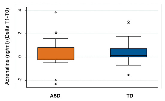 Differences (T1-T0) for adrenaline (ng/mL) in ASD and TD session. The figure shows the upper and lower quartiles (box), medians (horizontal line in the box), minimum and maximum values (whiskers), and outliers (individual points); * p < 0.05.