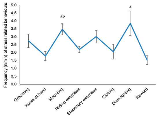 Frequency (n/min) of stress-related behaviours in horses in the different phases of the sessions (mean ± SEM). a: >“horse at hand, “closing”, and “reward” (all ps < 0.05); b: >“riding exercises” (p < 0.05).