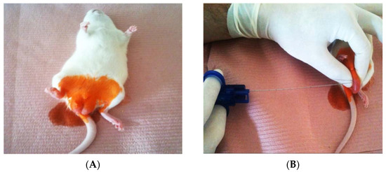 Intraoperative finding during the punch biopsy: (A)—Anesthetized rat after preparation of the operating field; (B)—Puncture of the testes using biopty gun.