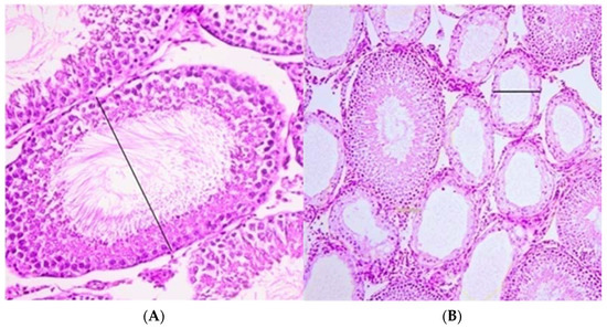 Testicular tissue, after fixation in 4% buffered formalin for 24 h, was processed using standard procedures of dehydration and waxing in histokinet Thermo Shandon (GMI Inc., Ramesey, MN 55303, USA). Afterwards, tissue was paraffin embedded and cut in 5-µm thick sections. The specimens for microscopy were mounted on slides, fixed in a thermostat for 15 min at 58–60 °C, deparaffinized by immersion for 30 min in xylol and rehydrated two times for 30 min in alcohol solutions of 100%, 96% and 70%, respectively. The sections were stained with standard hematoxylin-eosin method using an automated slide stainer (Sakura Tissue-Tek DRS 2000, Tokyo, Japan) and examined histologically. All tissue samples were analyzed by the same pathologist blinded to the assigned groups of prepubertal rats. Histological changes between the investigated groups were compared in terms of the number (mild—less than half of tubules are atrophic; moderate—more than half of tubules are atrophic; severe—all tubules are atrophic) and focality of atrophic seminiferous tubules (number of atrophic focuses or diffuse), the percentage of atrophy and the diameter of the tubules (Figure 2). Histological changes of seminiferous epithelium were analyzed according to Johnsen’s criteria [19,20].